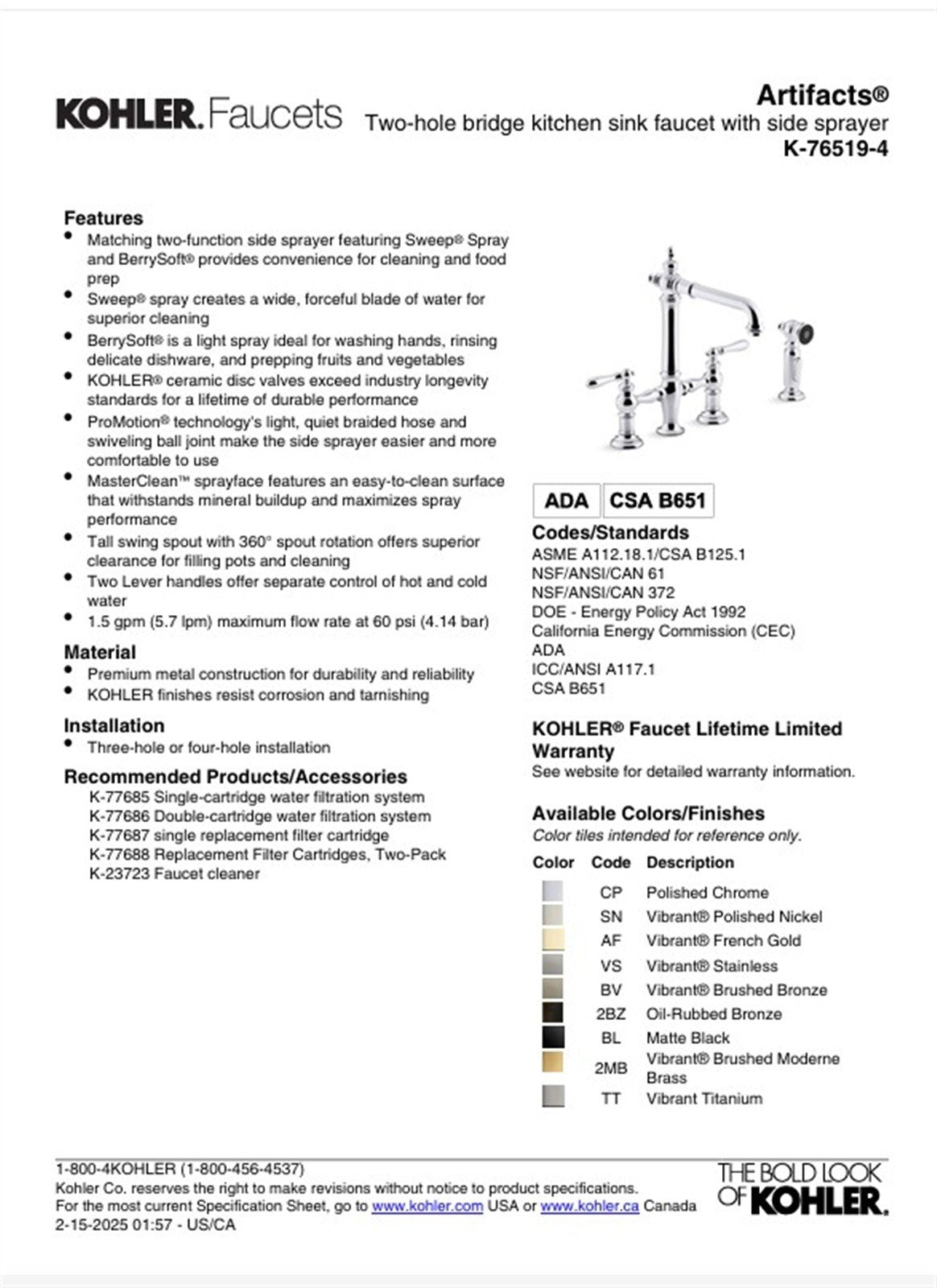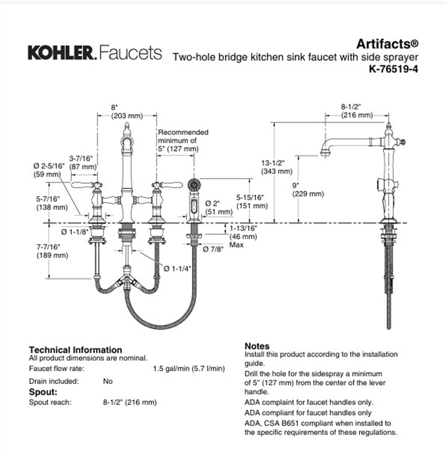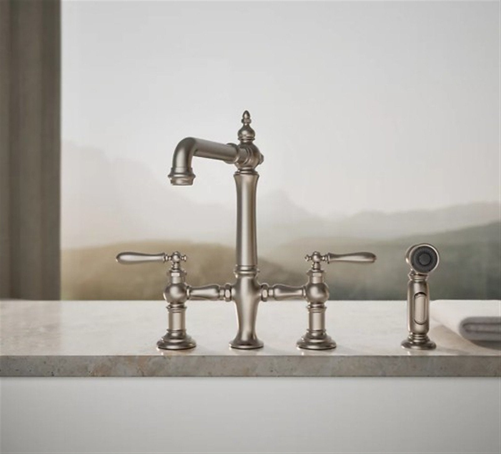 The KOHLER® Artifacts faucet collection brings you classic designs reimagined in fresh new ways for various task areas of the kitchen. This Artifacts deck-mount bridge faucet celebrates vintage style with its lever handles and Victorian-inspired full-swivel spout. A convenient side spray lets you switch from gentle BerrySoft® spray to powerful Sweep® spray at the touch of a button, so you're set for food prep as well as quick cleanup.