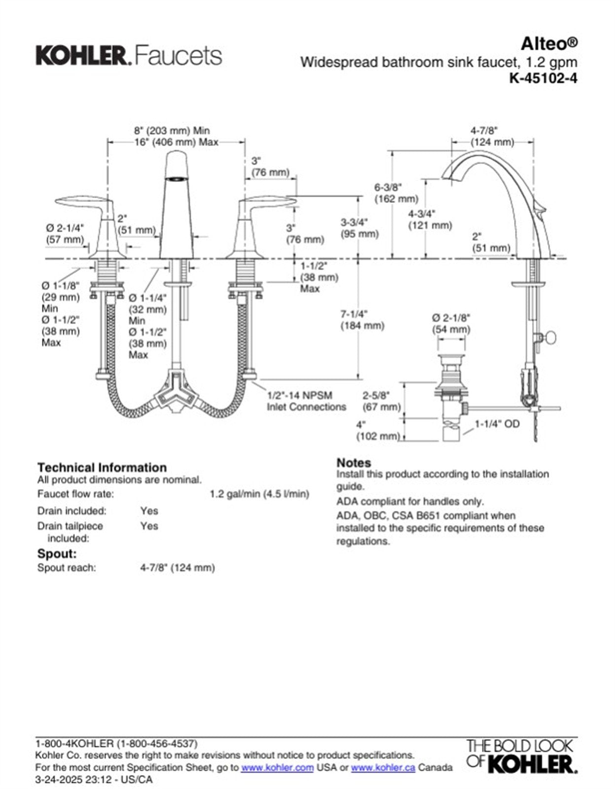 With sleek, confident curves inspired by nature, the Alteo faucet collection exudes a self-assured simplicity. Designed to deliver exceptional quality at an approachable price, the Alteo collection features fluid design lines that complement a wide range of decor. Available in a variety of KOHLER finishes to perfectly complementing any decor. 2-handle widespread lavatory faucet for 8 in. - 16 in. centers, Features a high-arched spout for more space to work within the lavatory, Features UltraGlide valve with dry stem technology that simplifies installation, offers smooth operation and precise, effortless control over water temperature and flow, KOHLER ceramic disc valves exceed industry longevity standards 2 times for a lifetime of durable performance, Flow rate range: 1.5 - 1.2, Polished Chrome, KOHLER finishes resist corrosion and tarnishing, exceeding industry durability standards over two times