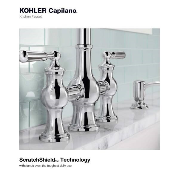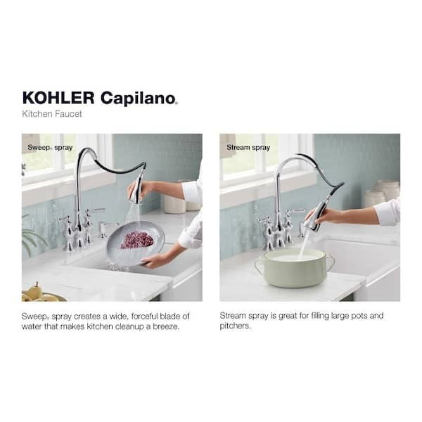 A fresh take on classic bridge faucets, the Capilano™ kitchen faucet references an era of design known for durability, functionality and efficiency. Authentic detailing throughout shows a rich historical influence, while the high-arch spout provides ample space for all of today's kitchen tasks. The pull-down sprayhead featuring Sweep® spray delivers a wide, forceful spray, simplifying kitchen cleanup.