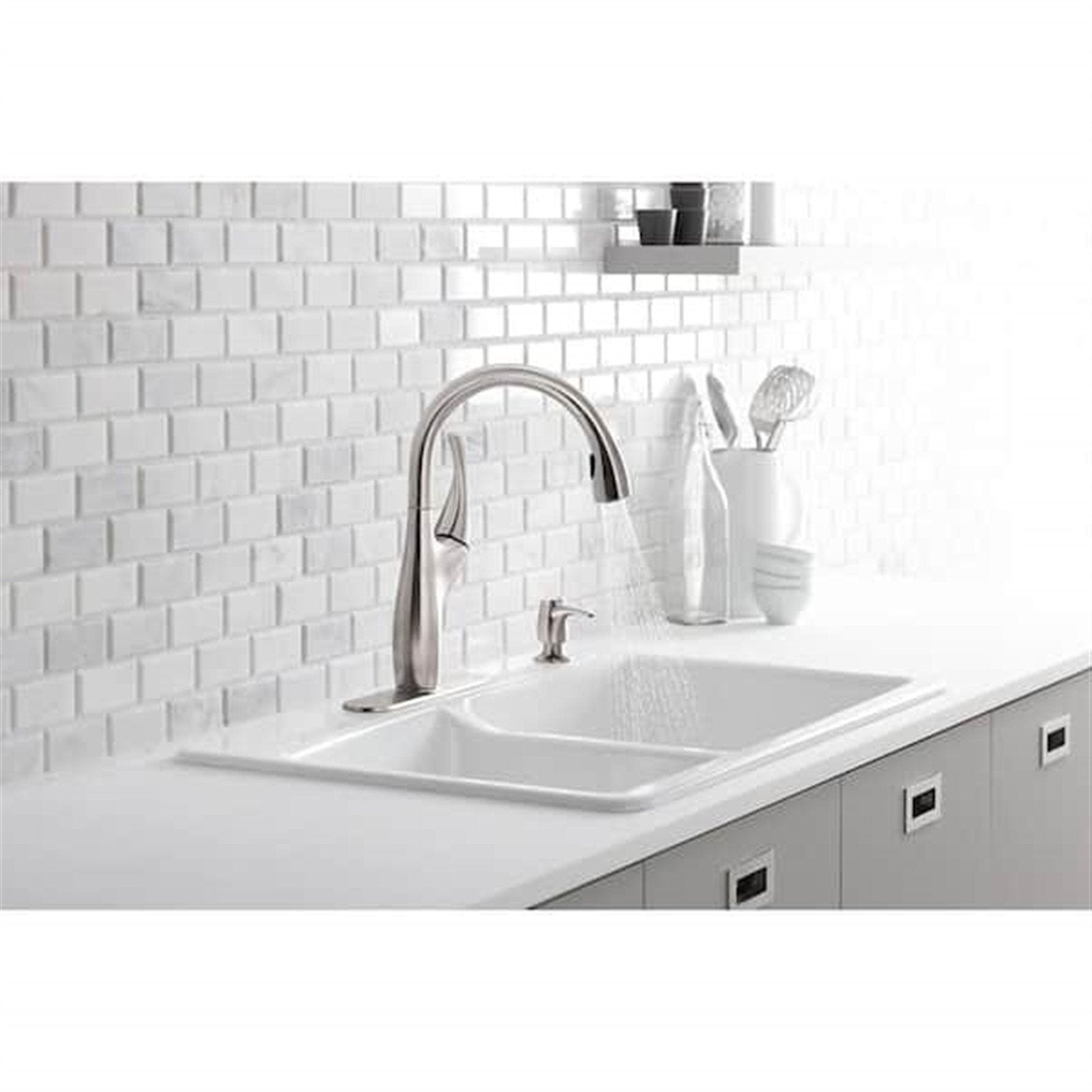 With a high-arch spout and smooth lines, the Mazz pull-down faucet makes a striking design statement with its elegant, graceful form. The unique joystick valve offers a hint of luxury with smooth, full rotation for effortless temperature and volume control. Mazz includes a coordinating soap/lotion dispenser. Sweep® spray creates a wide, forceful blade of water for superior cleaning. KOHLER's docking system, DockNetik®, secures the pull-down sprayhead to the spout.