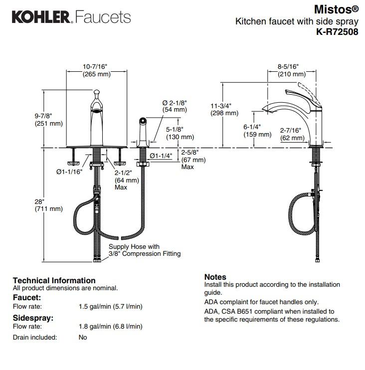 Kohler Mistos Kitchen Faucet 10" swing side spray Vibrant Stainless R72508-VS