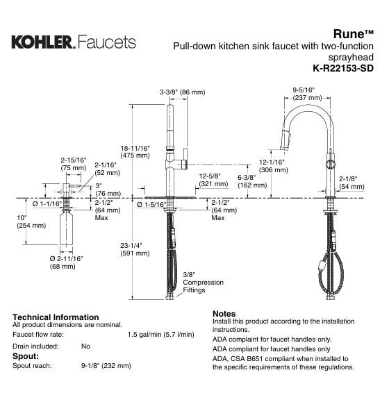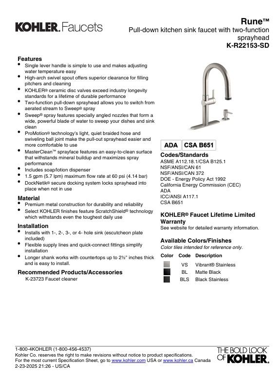 With clean, contemporary lines, the Rune pull-down kitchen faucet has a substantial feel that exudes durability. A single faucet handle adds to its streamlined look. Use the sprayhead's toggle control to switch between stream and powerful Sweep® spray for fast, efficient cleanup. This faucet includes a top-accessible soap/lotion dispenser that allows for easy refills.