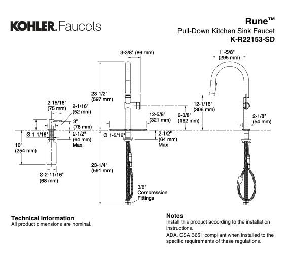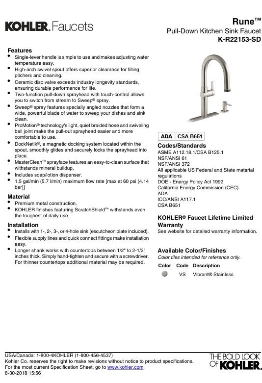 With clean, contemporary lines, the Rune pull-down kitchen faucet has a substantial feel that exudes durability. A single faucet handle adds to its streamlined look. Use the sprayhead's toggle control to switch between stream and powerful Sweep® spray for fast, efficient cleanup. This faucet includes a top-accessible soap/lotion dispenser that allows for easy refills.