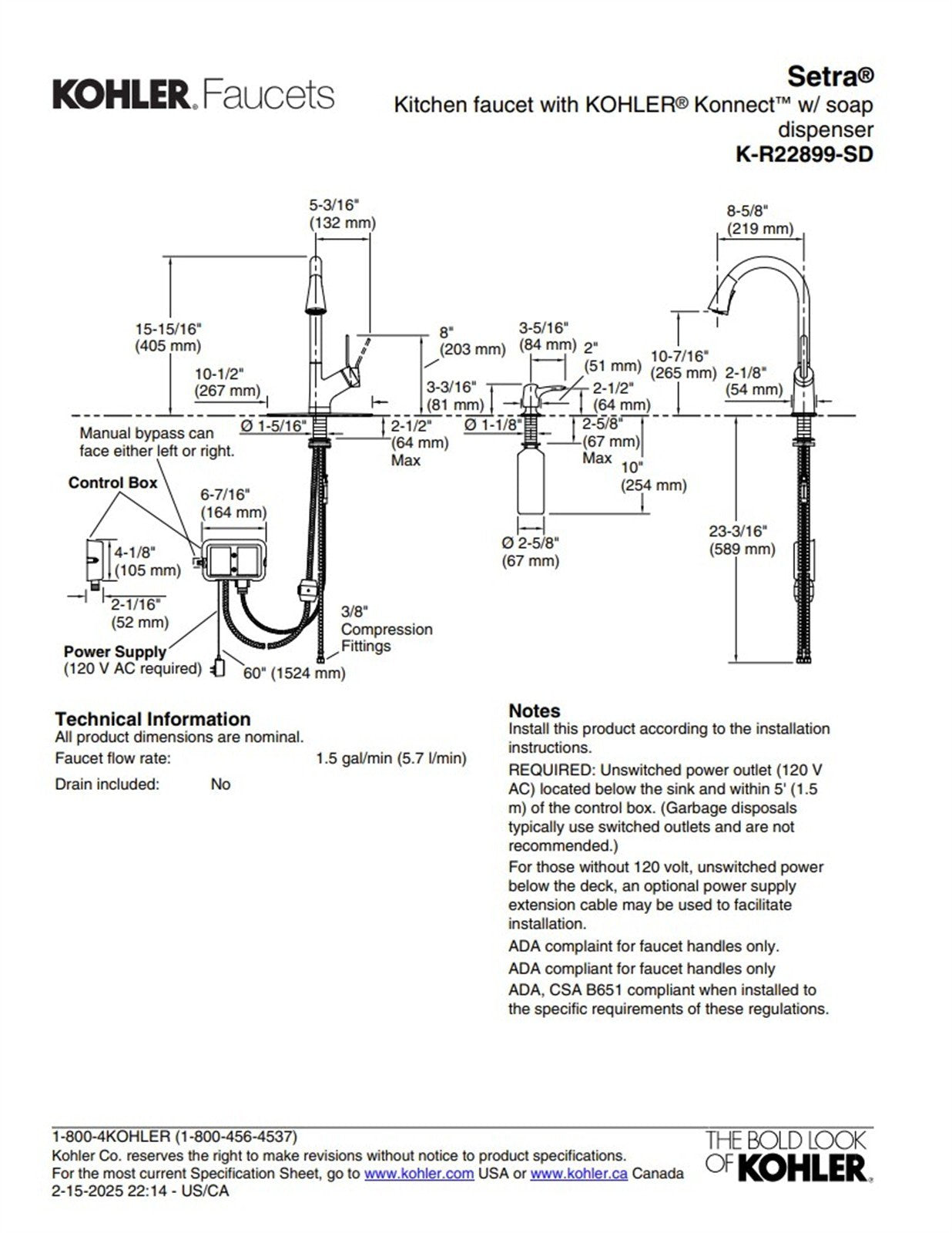 - Box includes: Assembled faucet, supply lines, valve box, escutcheon plate, top-fill soap/lotion dispenser, AC adapter