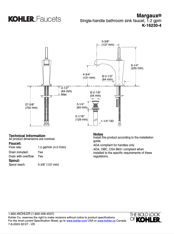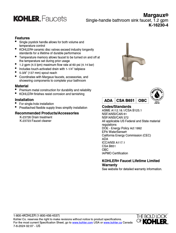 - Coordinates with Margaux faucets, accessories, and showering components to complete your bathroom