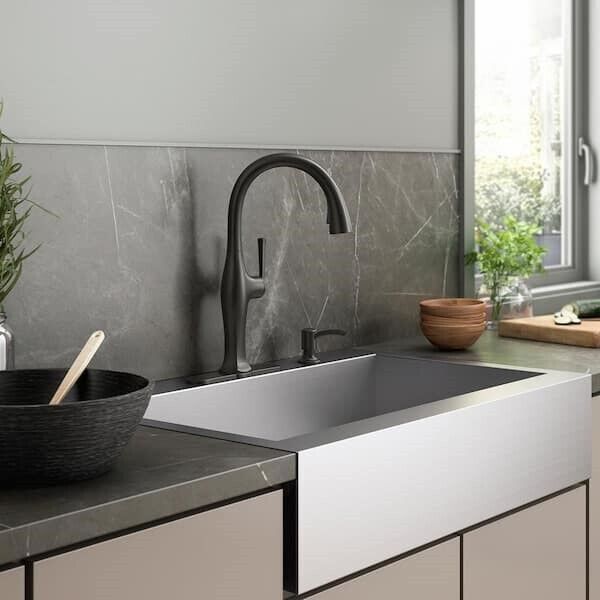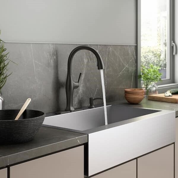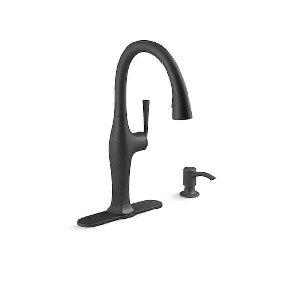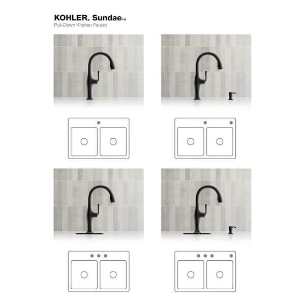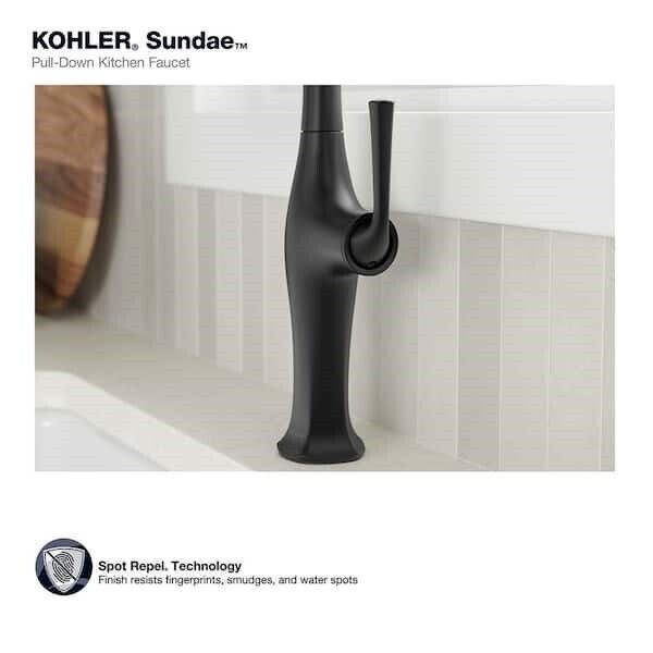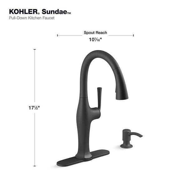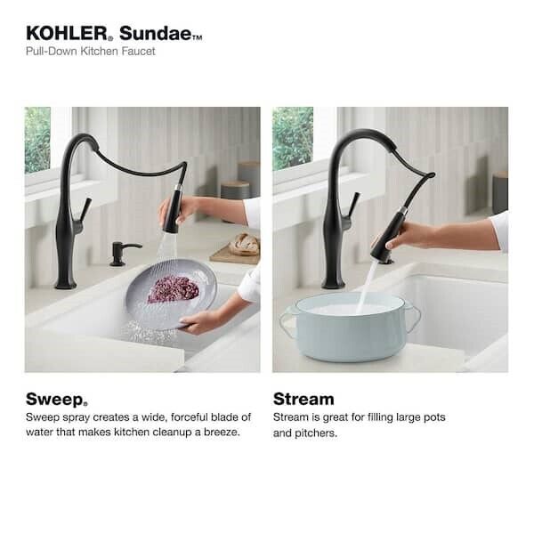 Sundae pull-down kitchen sink faucet has a casually chic style that combines refined facets, thoughtful intersections, and calm, elongated curves for a refined, classical look. It's designed for easy installation and features premium materials for a lifetime of reliable performance. The pull-down spray head switches between stream and Sweep spray, and the faucet includes a soap/lotion dispenser.